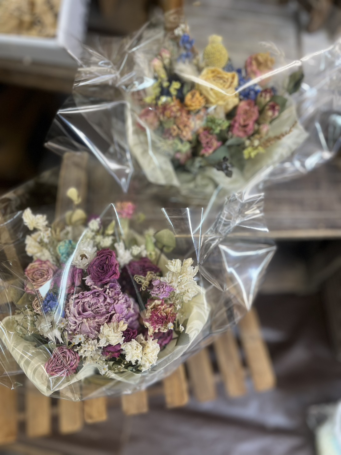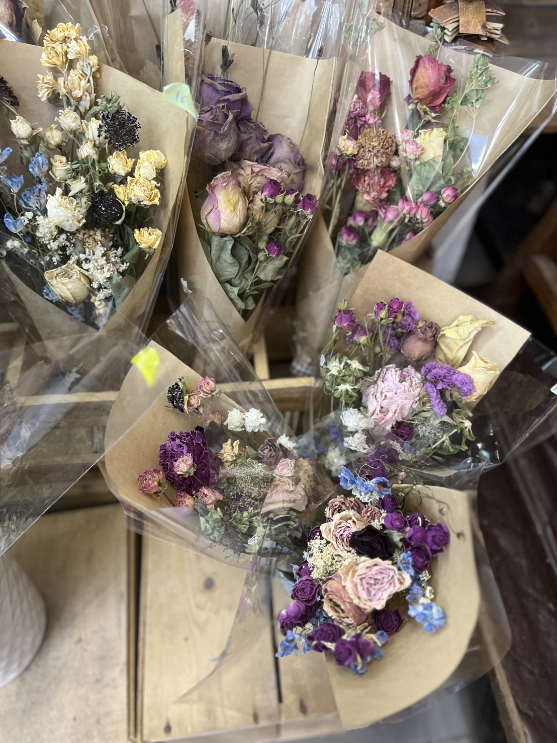 ドライフラワーの販売生花から自然乾燥で仕上がったドライフラワーをブーケ、スワッグ、アレンジ、リースの形にしています鮮やかな花色が時を経て変化していく姿はドライフラワーの魅力の一つです。人気高まるドライフラワー雑貨を見に来てくださいドライフラワーパック 500円ドライブーケ 1000円など